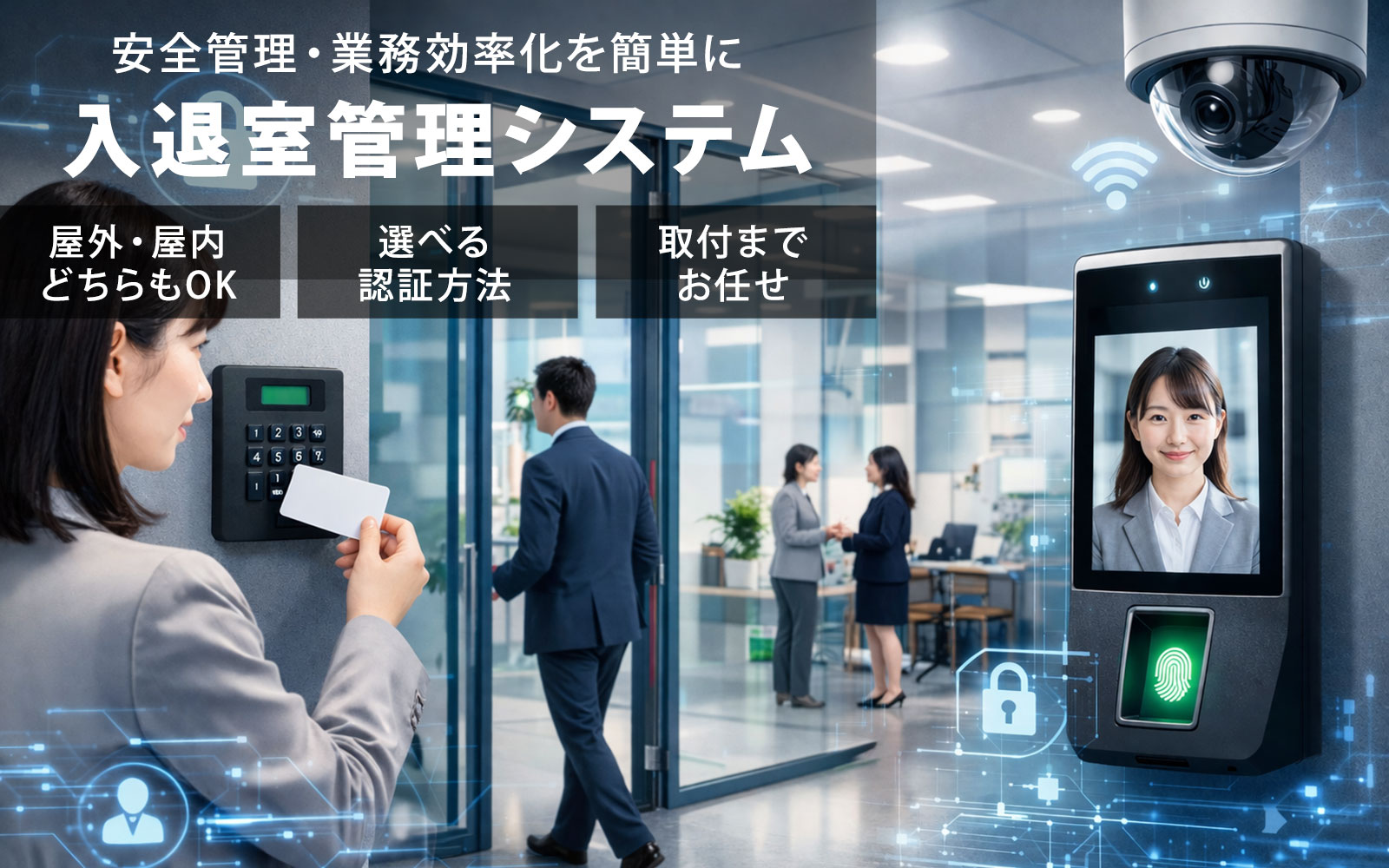 「入退室管理システム」とは、建物の入り口に設置されたリーダーを暗証番号・生体認証・ICカードなどの認証によって管理し、不法侵入や情報漏えいを防ぎ、いつ・誰が・どこに入退室したかを自動的に管理するシステムです。